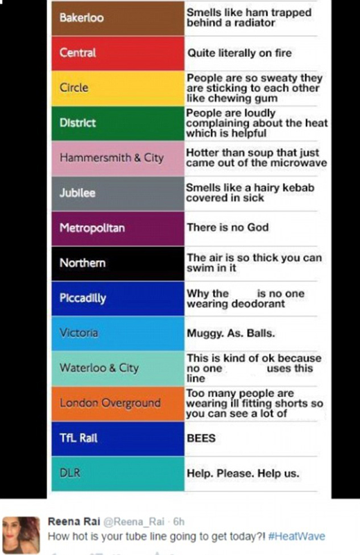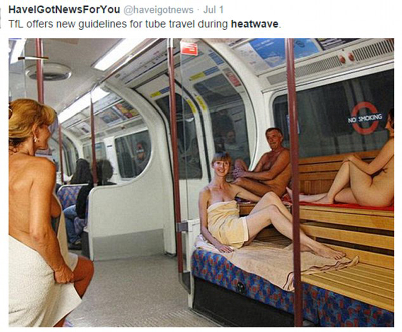 电视主持人菲妮·科顿 (Fearne Cotton) 发布自家萎蔫的烛台照片,并配文称:“面对高温,蜡烛已经放弃抵抗”。Twitter用户@haveigotnews戏称,令人窒息的伦敦地铁就像一个桑拿房,伦敦交通局(TFL)应该允许通勤者裸体乘车。他上传的PS照片还展示了乘车时“保持庄重”而不流汗的最好方式。图片中的男女都面带微笑,懒洋洋地坐在地铁中,只用毛巾盖住自己的身体。