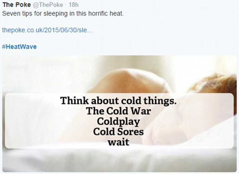 许多评论者称,他们发现晚上睡觉最难受,根本没有微风纳凉。Twitter用户@thepoke暗示,睡不着觉的人不要忙着数羊,而是应该多想想凉爽的东西。
