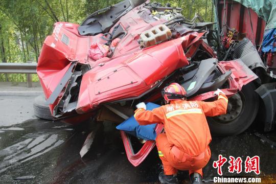 中新网丽水7月14日电 (记者 胡丰盛 通讯员 李正坤)13日17时19分许,浙江松阳县内,一辆运载水泥的挂车与前方车辆发生追尾,造成挂车司机受伤被困,上半身慢慢挂在驾驶室外,担心其受到二次伤害,现场救援的消防战士柳自翔爬上车头,肩扛着司机苦撑将近1小时,直至战友将其救出,他的举动,让不少路过群众都纷纷竖起大拇指为他点赞。