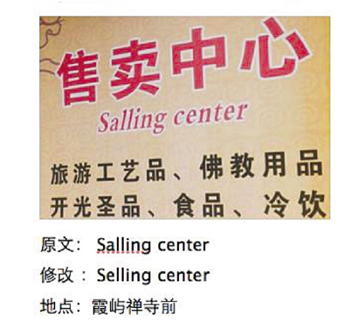 除了翻译不规范,还有一些拼写的错误。像“Selling center”写成了“Salling center”,意思就从售卖中心变成了萨林(丹麦城市)中心。