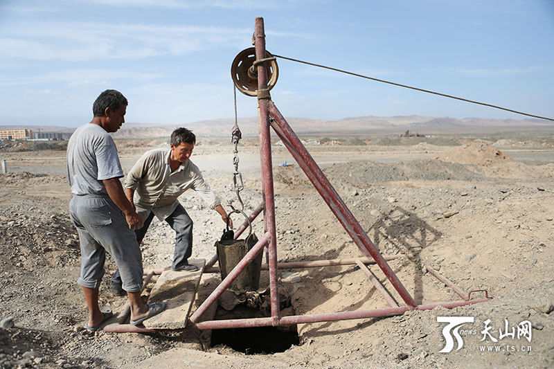 每天早上9点,库尔班·司马义准时到竖井旁开始工作,中午仅有一个小时的吃饭时间。在并不宽敞的竖井里一上一下,库尔班原本白色的衣服上一片一片的黑印。天气酷热难耐,库尔班·司马义只是擦擦汗,看着喊热的我们,眼睛笑成了一条缝儿,看到有人试图到井边去,他连忙提醒小心。