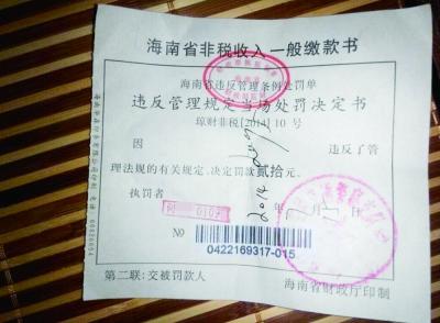 王女士介绍,7月15日下午,她骑电动车从海口和平南路前往一家培训机构。在和平天桥下,她骑着电动车驶上了人行道。“这条路我很少走,只是想快点过去,就骑车直接上了人行道,然后被执勤交警截住。执勤交警说我违规,随后对我处以罚款50元,并开一张罚单给我。我回家整理物品才发现这张罚单的面额是20元的,仔细看上面日期还写成了2014年7月15日。”王女士告诉记者,她骑电动车上人行道确实违规,但交警罚款50元却只开20元的票据,这不太正常,希望交警部门给她一个说法。“我不知道罚款人员的真实身份,他并没有向我出示证件,当时他戴着墨镜,所穿服装和交警的制服是一样的。我仔细查看罚单发现,上面“执罚者”处盖着“何××0109×”字样的私章。