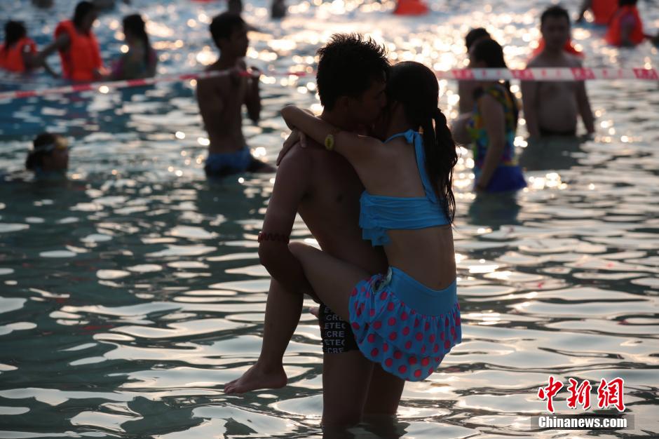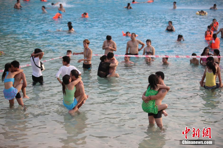 7月18日下午,广西南宁动物园加勒比水世界举办的“热吻大赛”上,主持人担忧游客难为情不敢报名,临时改规则为“贴脸赛”,不料大多选手还是展开了激吻。据介绍,热吻大赛参赛选手只要年满14岁,都可以以两人为一组的形式在水上进行。其中一方将同伴抱起接吻,坚持最久的将胜出。 王刚 摄