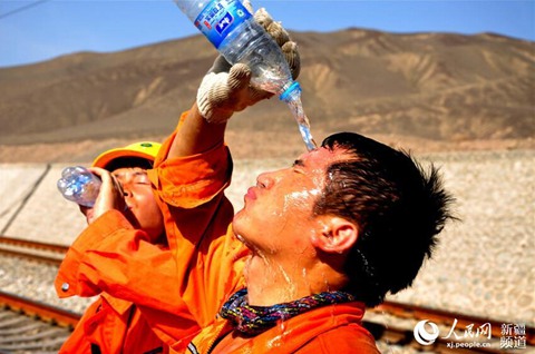 新疆高温天气下坚守岗位的铁路工人。(人民网-新疆频道 摆风亮 摄)