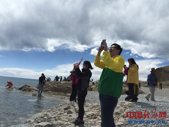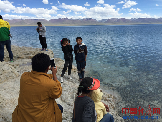 (游客在纳木错湖边拍照留影。中国经济网记者 代玲摄)