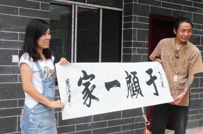 顾少强和于夫向记者展示朋友赠送的写了客栈名字的条幅。