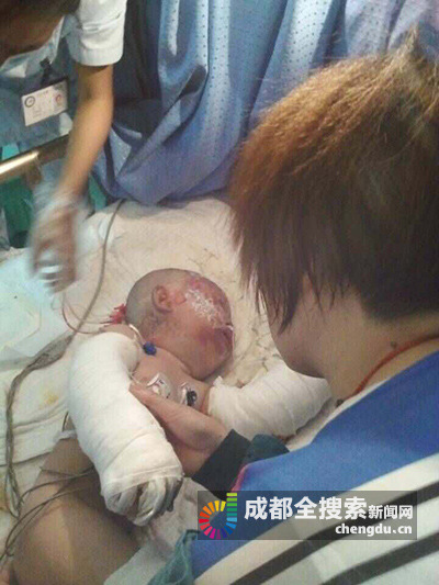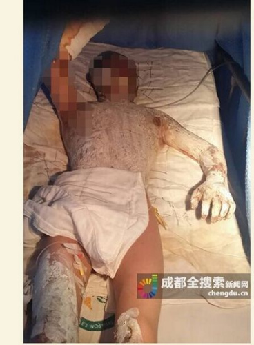 8月4日晚,成都商报记者在内江市第一人民医院烧伤科见到了正在病床上接受治疗的吴泽松和吴明亮父子,吴泽松的妻子粟本秀在一旁照顾。据医生介绍,吴泽松的烧伤面积超过40%,吴明亮烧伤面积达60%,目前情况比较稳定。但吴明亮年仅2岁的女儿至今仍在重症监护室接受抢救,情况十分严重。