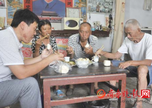 8月4日上午9点多秦普五才起床,穿上孙希贤刚给他洗好的白T恤、牛仔短裤,往地上一站,看上去既精神又时尚,更不像个智障老人。他搬着马扎来到村头树下乘凉,11点多回家,孙希贤的对象已经把饭做好,秦普五坐到饭桌旁,两个馒头一碗汤下肚,还小酌一杯。酒足饭饱之后,他回到自己的房间,开始了午休,下午4点多,太阳不太足了,天凉快了,他又搬着马扎坐到村头乘凉,衣食无忧,“仨饱一个倒”,这就是82岁的秦普五一天的生活,这样的生活是多少同龄老人向往的,而令人想不到的是,给他提供这么好晚年生活的,竟是跟自己没有任何血缘关系的人。