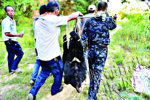 昨天下午5时40分左右,在庄田村的山路上,“落网”的第二头黑熊注射麻醉剂后,被归真堂工作人员和村民合力抬下山。山路崎岖,抬熊下山花了一个多小时。