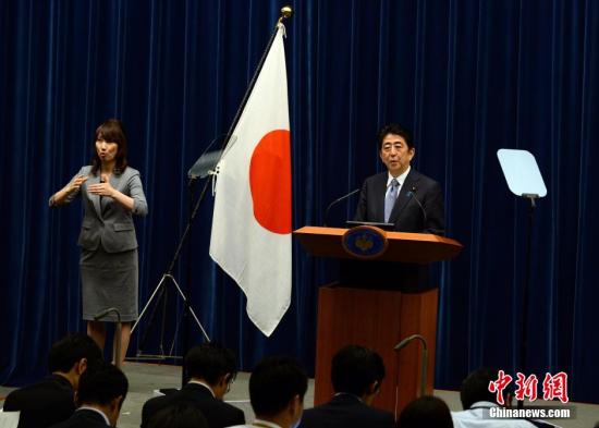 日本政府8月14日傍晚在临时内阁会议上通过了战后70周年首相安倍晋三的谈话。安倍此后在首相官邸举行记者会,正式发表了该份谈话。 中新社发 东友 摄