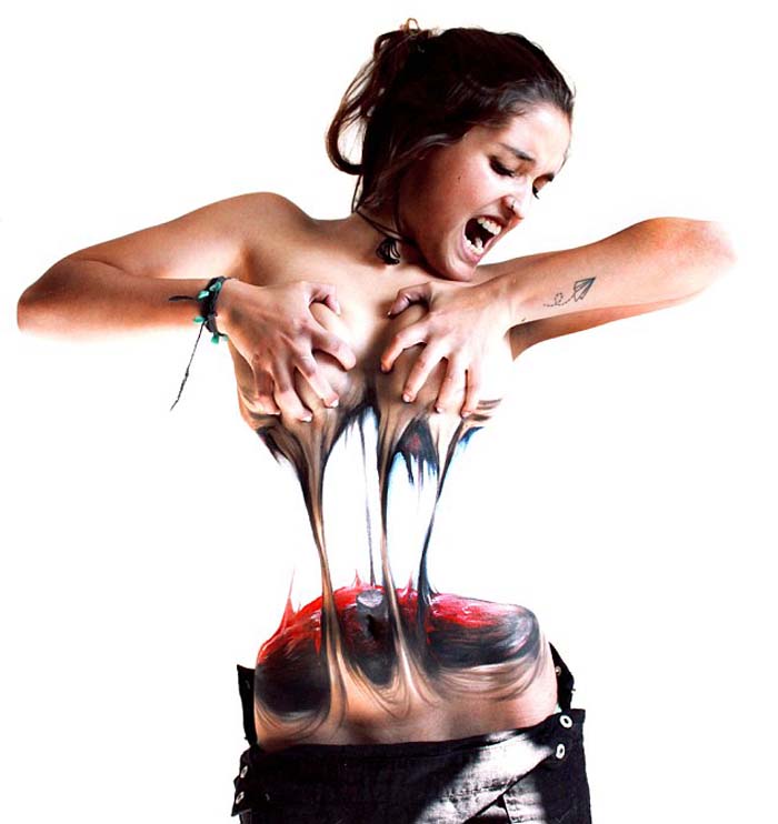 国际在线专稿:据英国《每日邮报》8月19日报道,来自智力圣地亚哥的29岁人体彩绘艺术家吉米皮尔·迪纳马卡·葡奇(Jeampiere Dinamarca Poque)在裸体女模特身上作画,用细致入微的笔触创作出一幅幅模特们撕裂身体的逼真效果图,恐怖至极让人触目惊心。
