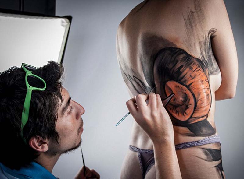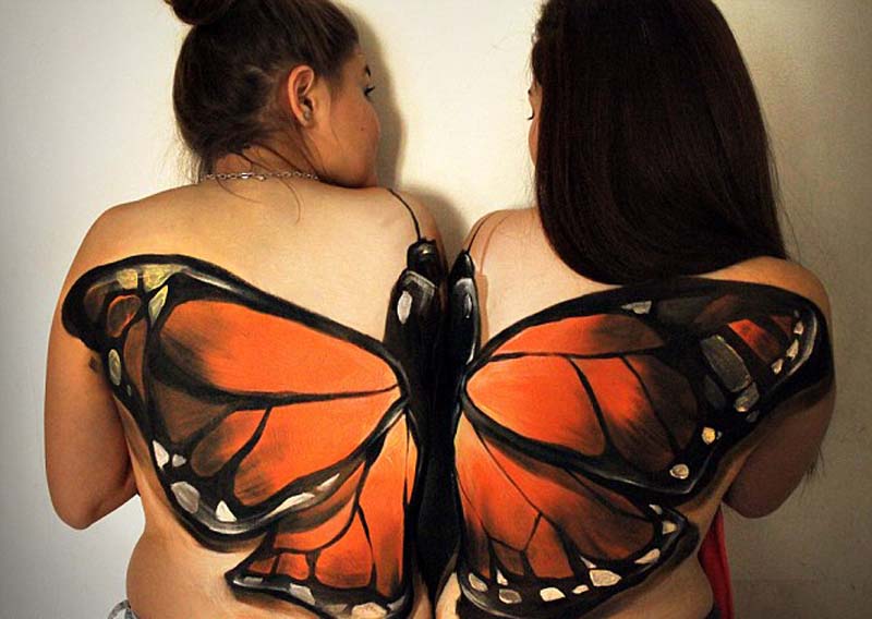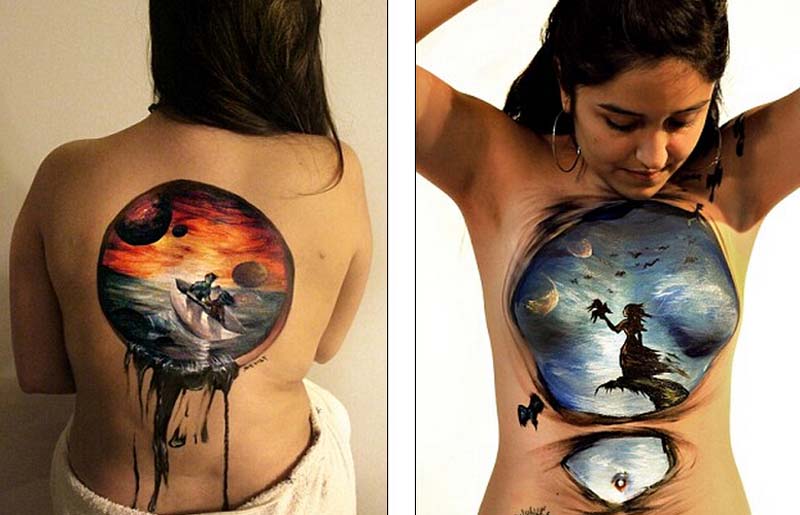 葡奇在这两位模特身上创作的立体画。(网页截图)