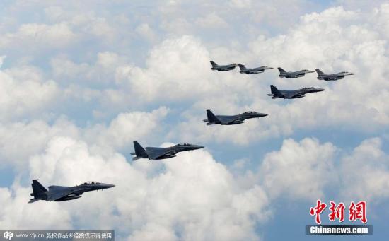 当地时间2015年8月22日,韩美空军8架战机在半岛上空针对朝鲜进行了约一个小时的“示威飞行”,美国空军所属4架F-16战机和韩国空军所属4架F-15K战机参加飞行。 图片来源:CFP视觉中国