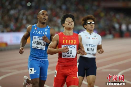 8月22日,在北京国家体育场“鸟巢”进行的2015年国际田联田径世锦赛男子100米预赛中,中国选手苏炳添(中)以10秒03的成绩晋级半决赛。 中新社发 盛佳鹏 摄