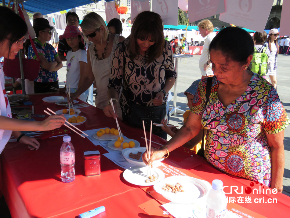 此外,许多当地居民还热情地向孔子学院和伯尔尼中文学校的老师们了解汉语学习,感受中华语言文字的魅力。中国结、檀香扇、剪纸、茶具、九连环、京剧脸谱等具有中国特色的工艺品也让不少当地人驻足购买,并连连称赞其中的精妙之处。在欣赏中国文化的同时,许多观众也拿起筷子,亲身体验了一把中国人的餐饮的方式,“我尝试使用筷子,确实有些难,(笑声),我学了差不多10分钟,夹起了(盘子里)所有的花生,但大一些的乒乓球,我没夹起来,(笑声)。”