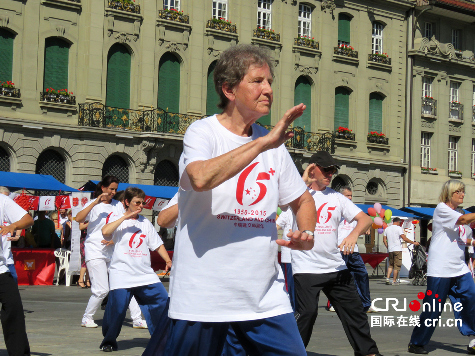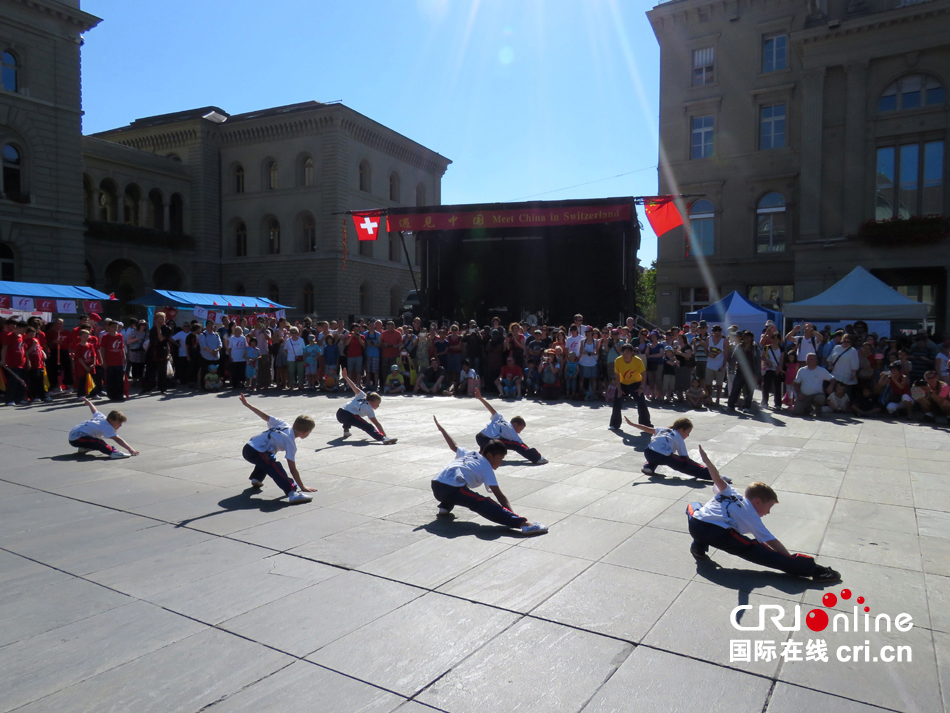 除了广场四周各个展台对中国传统文化全方位的展示,一场汇聚了中瑞艺术家们精彩表演的露天演出也在同时进行。舞蹈《多彩的哈达》通过对藏族文化的诠释,表现出了中国各族人民其乐融融、和睦相处的美好景象;童声合唱《龙的传人》、《好一朵美丽的茉莉花》是瑞士的华裔小朋友们通过歌声传达他们对祖国的思念和对中国文化的赞美;而《二十四式太极拳》和《武术》则展现了天人合一、万物皆化的中国传统哲学思想,以及人与自然的和谐。其中一位参与太极拳演出的瑞士老人身体健朗、气色红润,她今年已经79岁了,她说正是太极拳让她拥有如此健康的身体:“我很喜欢,我练太极拳已经有些年头了,这对身体非常好,不然我不会是现在状态。2009年我摔断了胯骨,此后的两年里我过得很不好,而现在我可以重新工作,这些都多亏了太极。我现在柔韧性不错,比不了年轻人,但在我这个年龄还是不错的。”