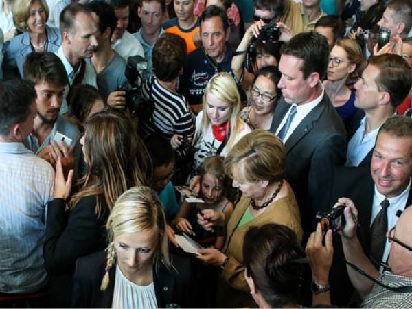 图:默克尔给参观市民签名
