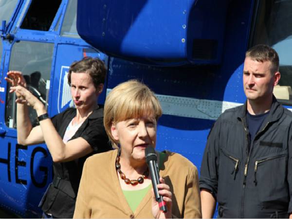 30日下午,默克尔在总理府与公众见面,在开放日寄语结束后,开始了她的总理府巡游。当走到总理府后庭院里一架巨大的深蓝色警用直升机前,默克尔停下了脚步,并开始向游客讲述有关这架直升机的“小秘密”。