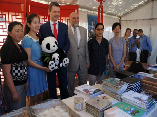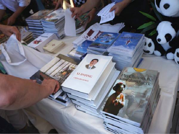 中国展台上还摆放了《中国历史概况》《中国陶瓷文化》《快乐汉语》《中国少数民族》等13类英语或德语书籍,供游客免费索取。大使馆的工作人员介绍说,中国展台此次共准备了近2000册图书,其中有关中国剪纸或邮票等文化类书籍和语言类书籍格外受德国人欢迎。