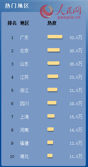 数据显示,广东、北京、山东的网民最爱微博聊阅兵话题,其他位居排行榜前十位的地区还有江苏、浙江、四川、上海、河南、福建、湖北。