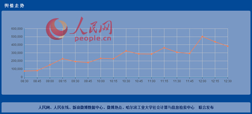 该策划共采集网民有关阅兵的原创微博及转发微博总帖量为453万人次。数据显示,网民参与发帖的峰值点出现在中午12:00,峰值数据为50万人次。