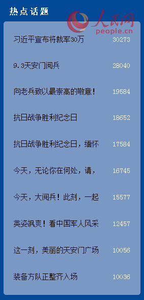 整个阅兵过程威武雄壮,高潮迭起。人民网大数据策划“网民情绪展示”中,登上十大热点话题排行榜的话题分别是:“习近平宣布将裁军30万”、“9.3天安门阅兵”、“向老兵致以最崇高的敬意!”、“抗日战争胜利纪念日”、“抗日战争胜利纪念日,缅怀先烈,祭奠同胞!”、“今天,无论你在何处,请为阅兵喝彩,为中国点赞!”、“今天,大阅兵!此刻,一起传递!庆祝胜利!分享荣光!”、“英姿飒爽!看中国军人风采!”、“这一刻,美丽的天安门广场”、“装备方队正整齐入场”。
