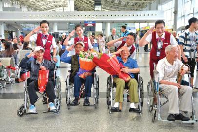 (9月4日,参加胜利日阅兵的川籍抗战老兵乘飞机回到成都。)