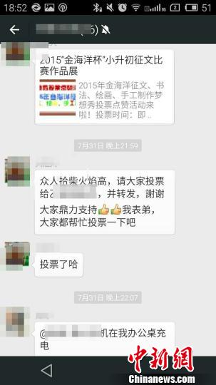 微信朋友圈里,许多家长纷纷化身“拉票族”,发动各种人情攻势,疯狂向亲友们“求投票”。有人大呼,自己的朋友圈被这群“拉票族”道德绑架了。
