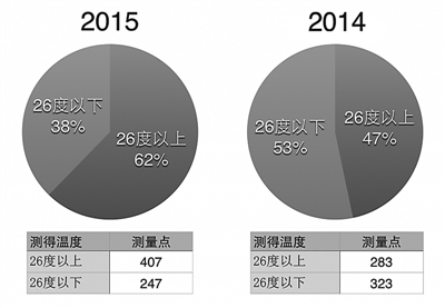 自然之友发布的2014年、2015年公共建筑室温测量数据对比。