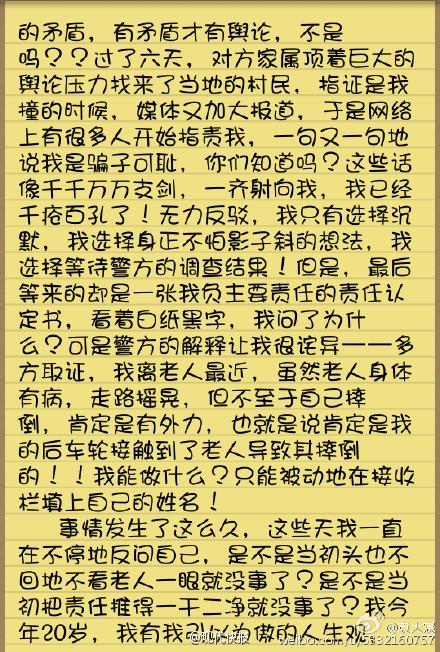 出人意料的是,事件在9月13日开始陡转急下,网友“磊磊0324”在微博发布了3段视频,指证女生撞人,舆论哗然,女大学生成为舆论谴责的对象。