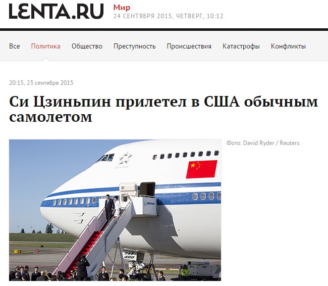 国际在线报道(记者 王德禄 赵雪):Lenta新闻网以一篇博眼球的文章作为报道中国国家主席习近平访美的开篇之作:《习近平乘普通航班抵美》。“中国领导人并没有自己的‘空军一号’”, 习近平访美乘坐的是一架波音747-400型普通航班,该飞机隶属中国国际航空公司。飞机内部经过改装,设有客厅、卧室和办公区。执飞完出访任务后,这架飞机将再次改装,搭载普通乘客。