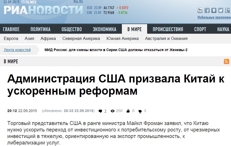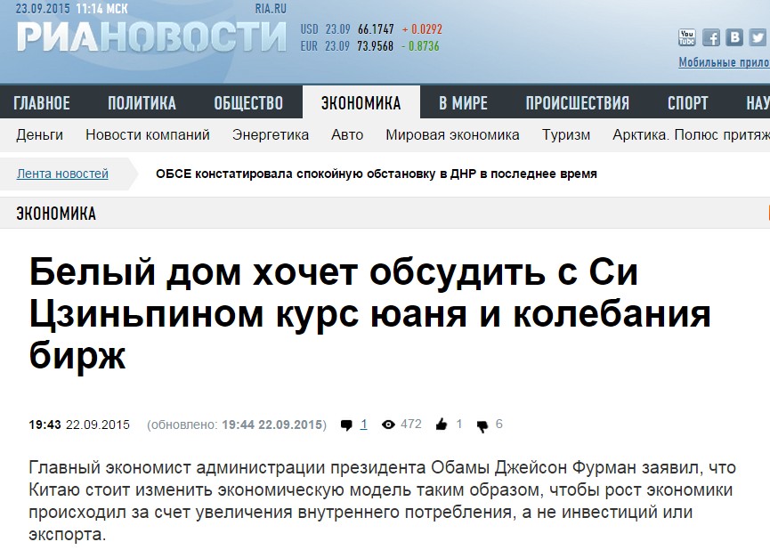 按照俄罗斯媒体的评判,美国近期对华关系的两个重点是经济改革和网络安全。“今日俄罗斯”国际新闻通讯社(即俄新社)分别《美当局呼吁中国加快改革》和《白宫将与习近平讨论人民币汇率及股市震荡》为题,报道了华盛顿方面的关切。