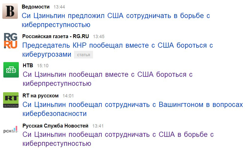 中美网络安全合作是俄罗斯媒体关注的重点。《导报》、《俄罗斯报》、独立电视台、RT电视台、俄罗斯新闻社等发表了《习近平建议与美国合作打击网络犯罪》、《中国国家主席承诺与美国共同应对网络威胁》、《习近平承诺与华盛顿在网络安全领域开展合作》等文章。