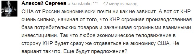 美国在经济上一点也不依赖俄罗斯,反而很依赖中国。这种依赖性起自中国是巨大的消费品生产国,终于中美两国有着庞大的相互投资。因此,中国在经济上的任何动作都将很快传导给美国经济。这是肯定的,有什么办法呢?
