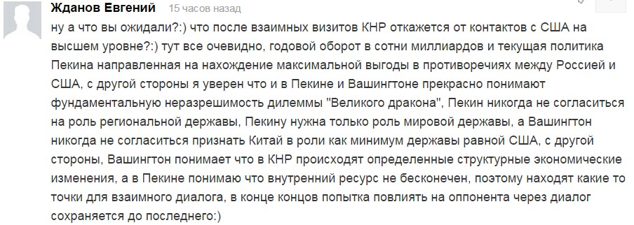 你们在期待什么呢?互访后中国会拒绝与美国保持高层联系么?很明显,中美两国年度贸易额在数千亿量级,而且中国目前的政策是利用俄美矛盾攫取最大利益;另一方面,中美在中国崛起方面有着不可调和的立场:中国肯定不满足地区大国的地位,而是着眼于世界超级大国地位,但是美国绝对不会允许中国成为与自己平起平坐的世界强国。美国深知目前中国正在进行经济结构调整,而中国自身也明白,国内资源并非取之不竭,因此正在寻找进行对话的契合点,以期通过对话对对手产生影响。