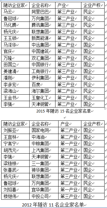 从这两次变化发现:(1)陪同出访的民营企业家人数越来越多,比重越来越大。2012年,在11名出访企业家中,仅有4名是来自民营企业,而2015年,在15名企业家中,有10名是来自民营企业,占大多数。(2)从陪同出访的企业领域来看,更偏向新兴产业领域。2012年,仅有联想集团杨元庆属于新兴产业,其他多是传统的能源、电力和制造业等,而2015年,除了联想集团的杨元庆,则增加了阿里巴巴的马云、腾讯集团的马化腾、百度集团的李彦宏等互联网行业的代表。