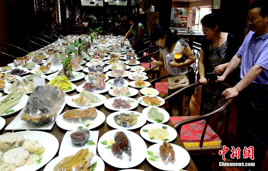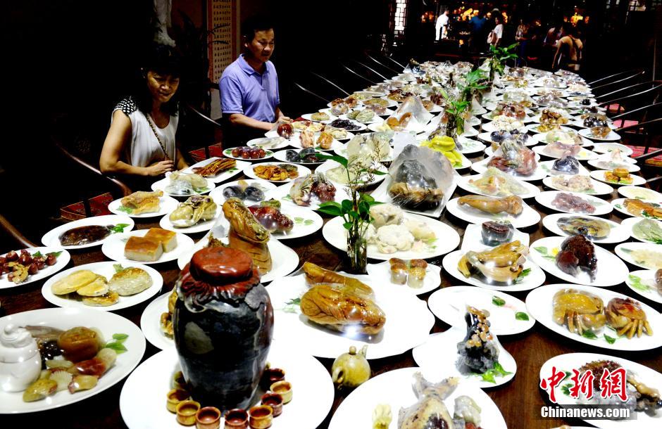 9月24日,传统中秋节将至,由福州寿山石雕刻艺术家孙兆勇历时近20年潜心收集、创作,利用月尾石、善伯冻、艾叶绿、老岭石、芙蓉石、杜陵石等几十种寿山石雕刻创作而成的 “寿山石满汉全席”143道“菜肴”在福州百宴轩寿山石艺术馆展出,吸引众多市民及外地游客的眼球。中新社记者 刘可耕 摄