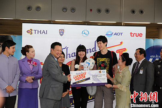 9月30日,泰国迎来今年第2200万名入境游客,来自北京的“90后”女孩金海玉意外成为幸运儿,她和同行男友在曼谷素万那普国际机场受到热烈欢迎。泰国旅游局、泰航国际公司等向其赠送“大礼包”,包括2张一年期有效的机票、5晚免费酒店住宿、一部手机及7天免费上网服务等。泰国旅游局局长育塔萨在现场表示,泰国已加强安保措施,提升旅游服务,欢迎更多中国游客来泰观光。