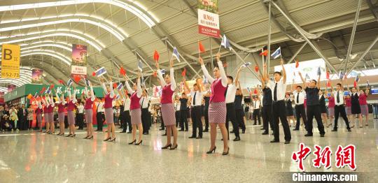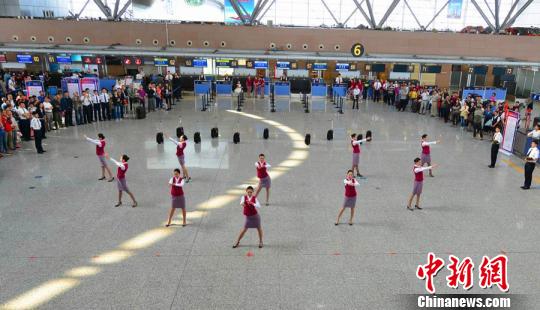 (郑州机场空姐演绎国庆欢乐舞。 杨现利 摄)