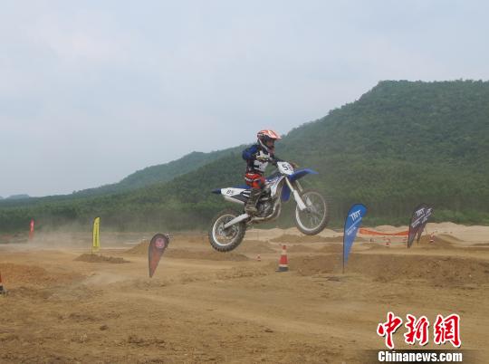 图为2015年海南白沙“摩托车车迷节”,上演摩托车越野场地赛。图为比赛现场,飞跃的摩托车。 付美斌 摄