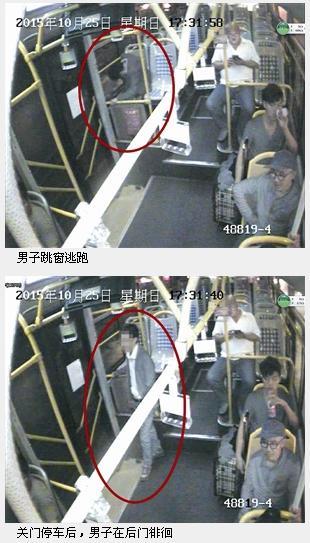 公交车突然停在路边,该男子见情况不妙,有些坐不住了。他从座位上站起来走到车厢后门处徘徊,前前后后张望了一阵,试图趁乱逃跑。但毛师傅早就将前后门关闭,根本出不去。他转身回到车厢后门边上的位置,假装若无其事打开车窗,随后猛地从车窗钻出去逃跑了。