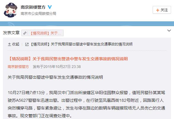 人民网北京10月28日电 据江苏省南京市公安局鼓楼分局微博通报,10月27日晚7点13分,南京市公安局鼓楼分局汉中门派出所接辖区华阳佳园群众报警,值班民警孙某某驾驶苏A5627警警车迅速出警。
