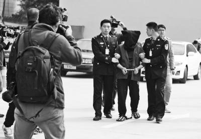 10时20分,看守所铁门打开,石二群身穿蓝色小马甲、头戴黑色头套,戴手铐、脚镣,被两名民警押出。他缓慢挪动,每走一步,都能听到脚镣磕碰地面发出的哗啦声。