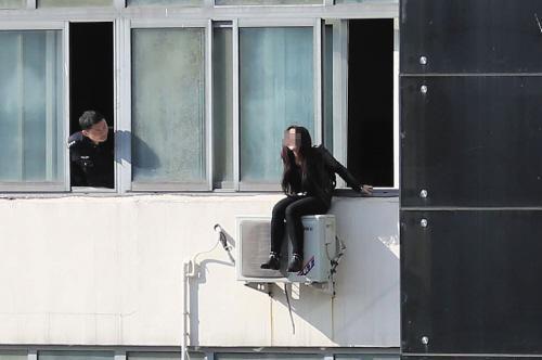 昨日上午,记者赶到事发建筑物时,女子仍盘坐在6楼窗外,情绪非常激动,不时大喊大叫。女子两腿悬空于窗外,摇摇欲坠,很是危险。消防员在2楼平台上铺设了消防救生气垫,民警则在楼顶和楼下两个方向上同时向女子喊话。记者了解到,女子是从6楼一房间爬上窗台的,房门被反锁,民警无法进入。