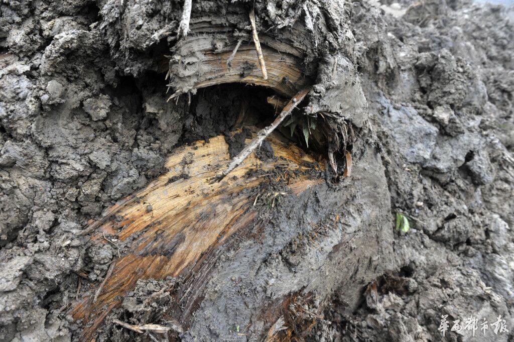 “现在挖出来看到的部分就有近10米,直径在60公分左右,还有一截埋在地里。”70多岁的村民乐先生说,“乌木”是承包这块田的老板,在11日凌晨2点左右找来挖掘机挖出的,当时附近有居民被吵醒,一开始都不知道怎么回事,直到早上才被路过的村民发现并将此事传开。
