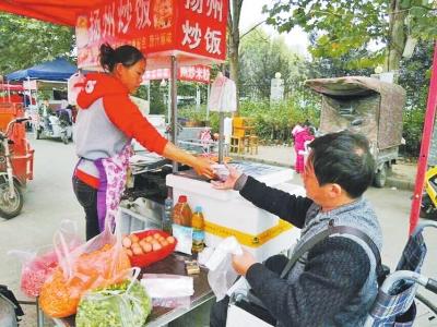 许红雪卖炒饭,李伟涛坐在轮椅上在一边帮忙。
