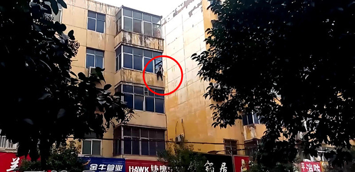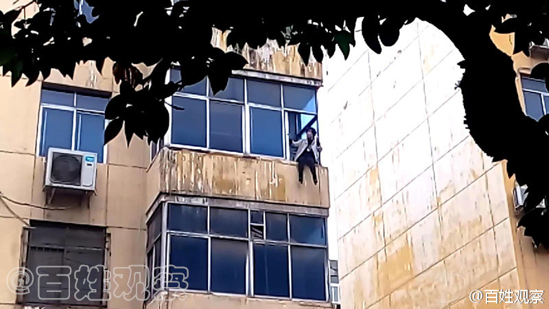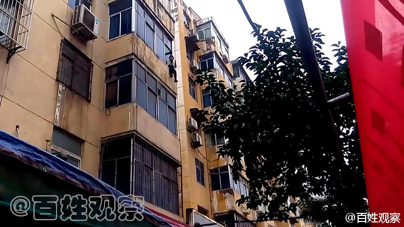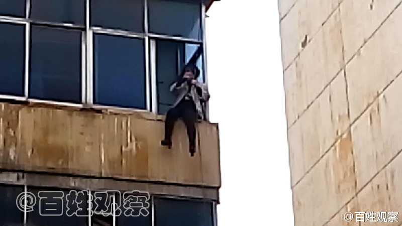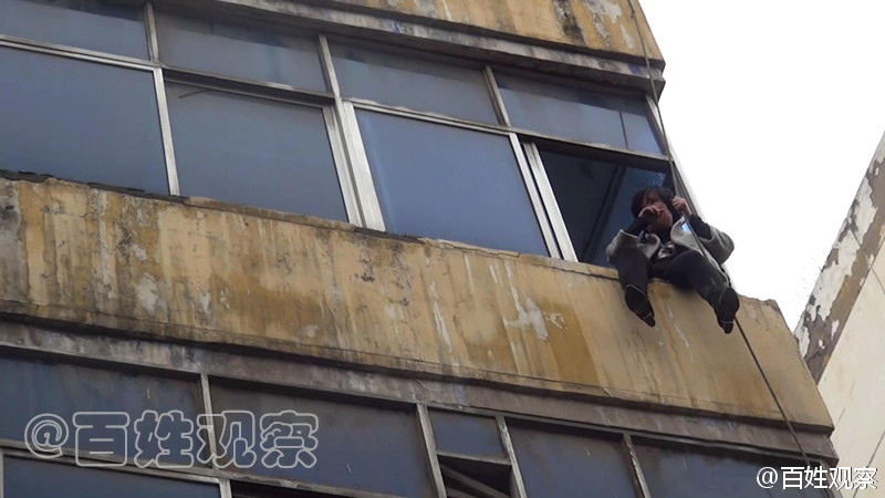2015年11月18日,河南焦作,一家属院4楼窗外,一名女子坐在厨房窗户外情绪激动要跳楼。消防官兵赶到后赶紧实施救援,僵持一个多小时,女子终于被救下。