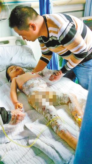 “现在我们帮孩子翻身时,稍微碰着都疼得大叫。”戴先生哽咽,儿子宇宇很坚强,上药时尽管疼痛,还是咬牙忍住,泪水在眼里打转。“他说他是男子汉。”