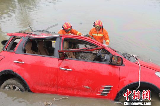 轿车失控坠入鱼塘 王申 摄