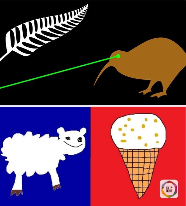 例如,在其中一幅投稿中,新西兰国鸟几维鸟的眼睛里射出几道绿色激光射线,俨然斗志昂扬的愤怒小鸟状,令人不禁莞尔;在另一幅投稿中,一只绵羊与一个蛋筒冰激凌并列,据设计师杰丝·吉布斯解释,因为新西兰人最爱绵羊和冰激凌。